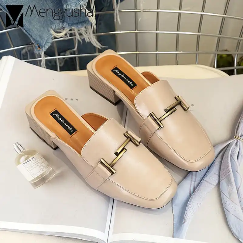 Eropa Wanita Merek Terkenal Mules Sandal Logam Gesper Sepatu Selop Wanita Persegi Ujung Kaki Med Tebal Tinggi Tumit Selop Wedge sandal| | - AliExpress