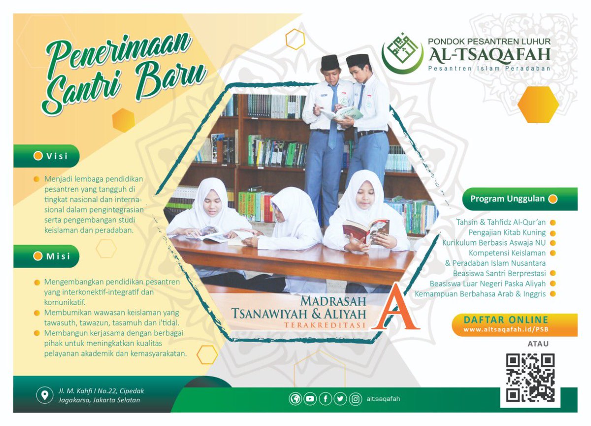 [ ](https://pbs.twimg.com/media/EIVzQpPWkAENjhH.jpg) Al-Tsaqafah on Twitter: "Brosur penerimaan santri baru (PSB) Pondok Pesantren Luhur Al-Tsaqafah TA 2020-2021 untuk tingkat Madrasah Tsanawiyah (MTs) dan Madrasah Aliyah (MA).… https://t.co/9zzdoqVDNL"