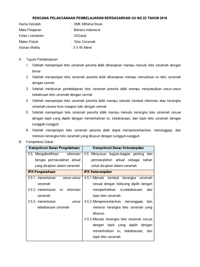 RPP B. Indo Kelas 11 rev 2018 3.6 dan 4.6 Teks Ceramah.docx - Sekolah Mata Pelajaran Kelas/Semester Materi Pokok Alokasi Waktu RENCANA PELAKSANAAN | Course Hero