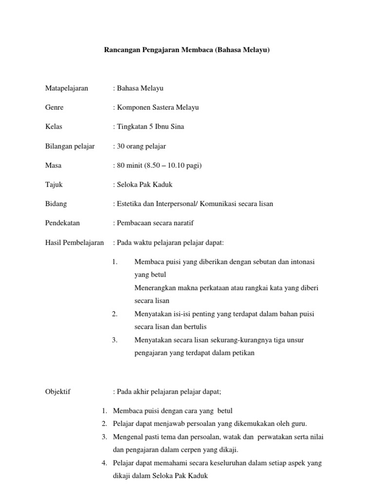 Rancangan Pengajaran Membaca (Bahasa Melayu)