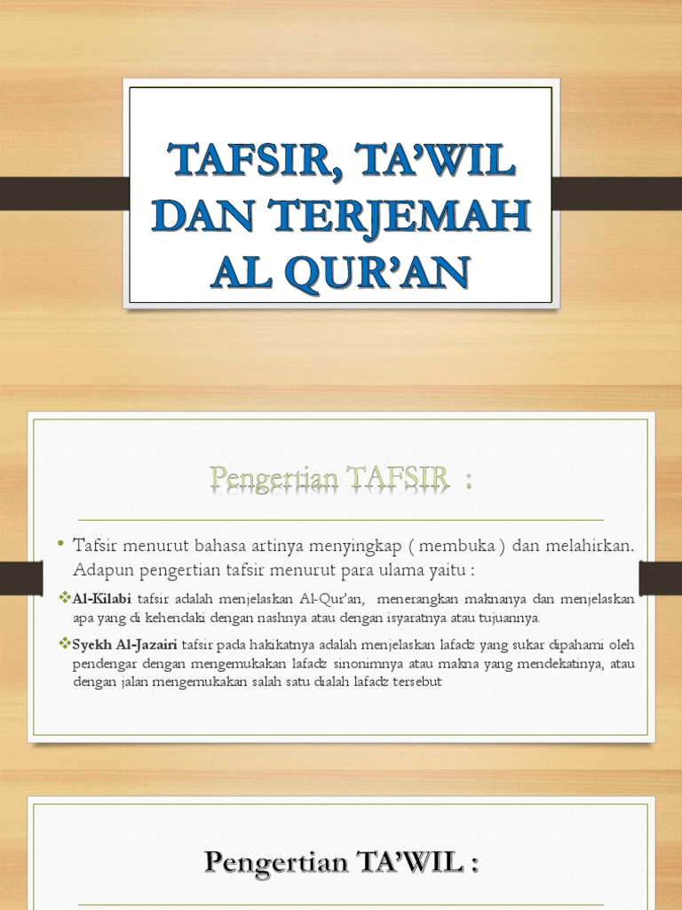 [ ](https://image.slidesharecdn.com/tafsirtawildantarjamah-141111214317-conversion-gate02/95/makalah-tafsir-tawil-dan-tarjamah-ulumul-quran-1-4-638.jpg?cb=1415743280) Makalah Tafsir, Ta'wil dan Tarjamah (Ulumul Qur'an 1)