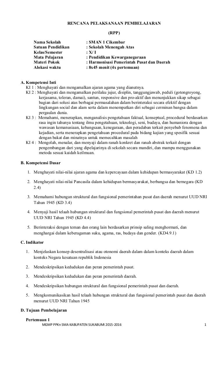 RPP PKn kelas X tentang Hubungan struktural dan fungsional pemerintahan pusat dan daerah menurut UUD Negara Republik Indonesia Tahun 1945 | Kumpulan Tugas Kuliah