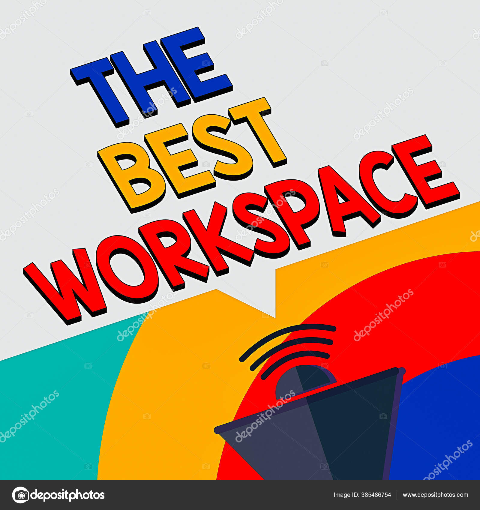 Tanda teks menunjukkan The Best Workspace. Foto konseptual Kondisi Kerja Komfortabel untuk Karyawan Perusahaan Megaphone Halftone dengan ikon Suara dan Bubble Pidato Geometrik Kosong. — Stok Foto © artursz #385486754