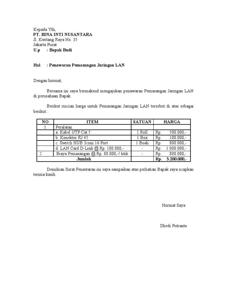 Surat Penawaran Pemasangan Jaringan Lan