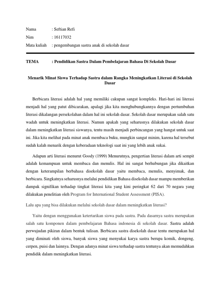 Tema: Pendidikan Sastra Dalam Pembelajaran Bahasa Di Sekolah …