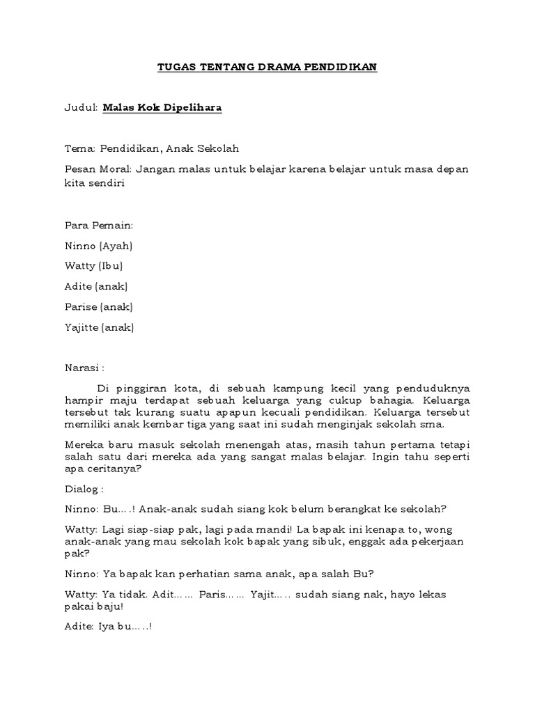 Naskah drama.doc - Malas Kok Dipelihara Tema Pendidikan Anak Sekolah Pesan Moral Jangan malas untuk belajar karena belajar untuk masa depan kita sendiri | Course Hero