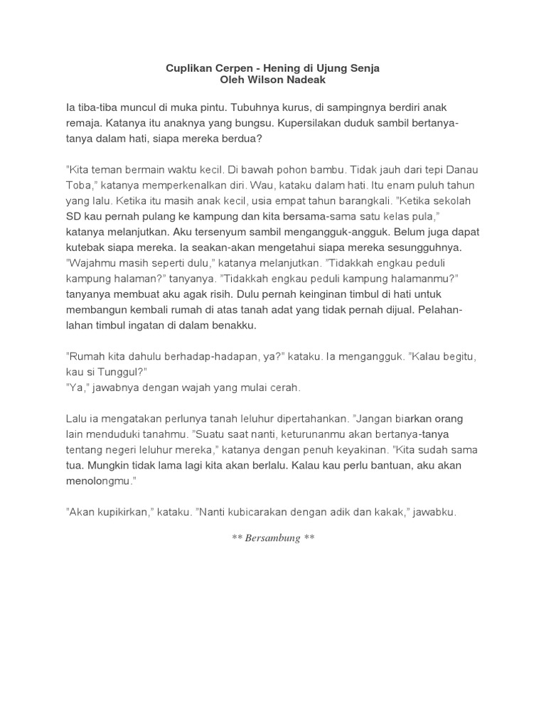 Bacalan cuplikan cerpen di bawah ini, kemudian tulislah karakter tokoh, latar (setting), tema, dan - Brainly.co.id